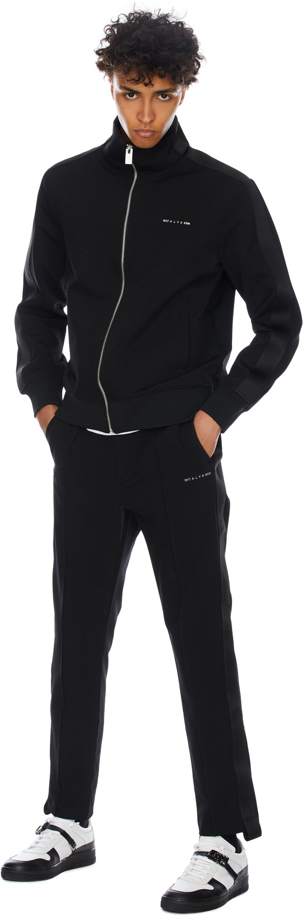 Black stretch poly nylon blend webbed tailored classic logo track pants. Elastic double stitch waist. Zip fly. Side welt piped slit pockets. Back welt piped drop-in pockets. Tonal webbed tape detail down side legs. Back leg darts. Front leg pin tuck detail. Tonal webbed hanging back tab with jacquard printed logo. Silver metallic '1017 ALYX 9SM' embossed decal logo on left leg. Tonal stitching.