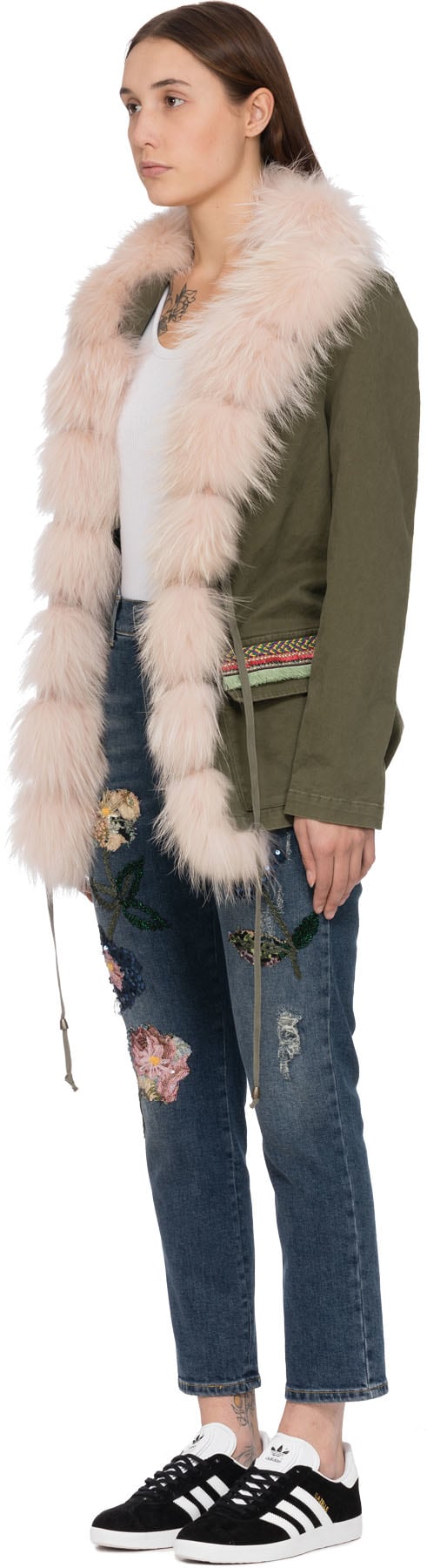 A canvas jacket with a tie front closure, soft pink fur trim, and vibrant embroidered accents. Features multiple pockets and an army inspired patch on the sleeve for a chic, utilitarian look.