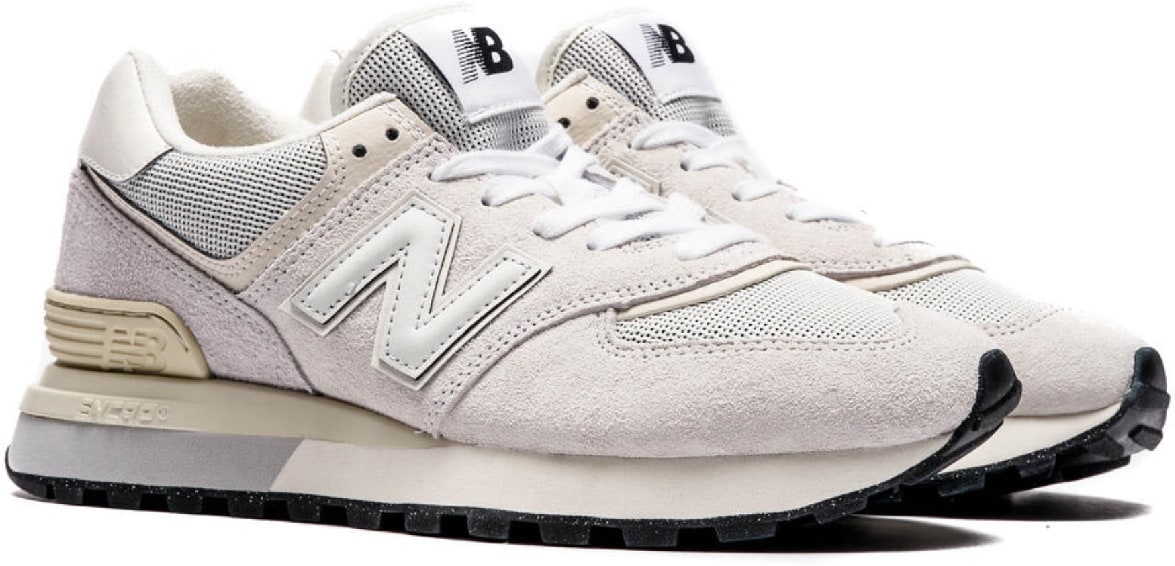 Baskets '574' grises, basses, classiques, modernes, robustes, polyvalentes et durables en daim sans chrome. - Fermeture à lacets à sept trous. - Doublure en textile souple. - Semelle intérieure amovible en mousse blanche. - Empiècement en cuir blanc au niveau du talon. - Capuchon de talon en daim gris. - Superpositions en cuir blanc. - Contrefort de talon en TPU moulé crème avec logo " NB " sculpté. - Semelle intermédiaire ENCAP blanche. - Semelle intermédiaire légère en mousse EVA bicolore. - Marquage " N " en cuir blanc embossé sur les côtés. - Logos : logo " NB " tissé noir sur la languette, impression graphique blanche " The Intelligent Choice " sur la semelle intérieure et logo graphique gris " New Balance " sur le talon.