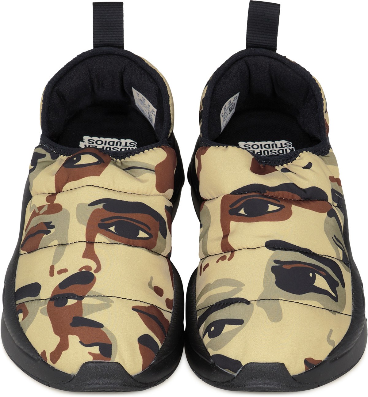 Baskets basses de style kaki pâle, modernes, ludiques et rétro inspirées des années 2000 rembourrées en nylon avec impression camouflage. Ouverture du col élastique noir. Tige et doublure matelassées. Semelle intérieure noire amovible. Tirette noire à sangle. Semelle intermédiaire légère Running System, de l'avant du pied au talon. Semelle intermédiaire noire ondulée. Semelle extérieure noire résistante et adhérente. Dessus imprimé camouflage. Logo graphique blanc 'Puma x KidSuper Studios' sur la semelle intérieure. Logo brodé noir et kaki clair 'Puma x KidSuper Studios' sur le talon. Logo imprimé "R-System" en relief sur le talon. Coutures contrastées. A enfiler.