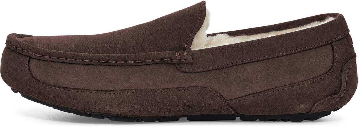 Pantoufles chaudes, durables et polyvalentes en peau de mouton veloutée de style mocassins. Doublure en peau de mouton naturelle en peluche. Assise plantaire amovible en mousse moulée. Semelle extérieure en caoutchouc moulé noir avec logo allover. Logo 'UGG' tissé sur la semelle intérieure. Logo "UGG" ton sur ton embossé à chaud sur le talon. A enfiler.