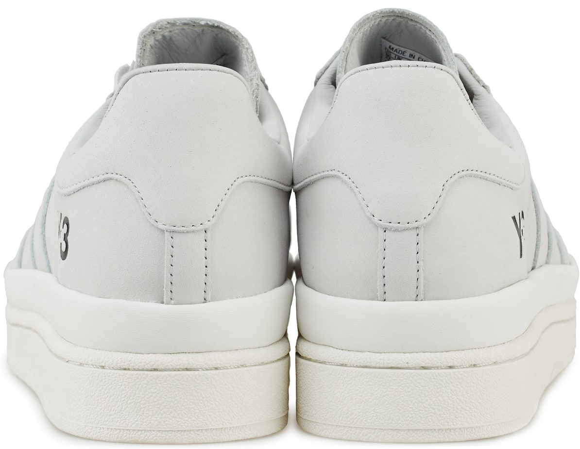 Chaussure à plateforme épaisse, grises, modernes, propres, minimalistes avec logo en cuir souple. Fermeture à lacets à sept trous. Semelle intérieure blanche. Doublure de col rembourrée. Patch de guérison en cuir tonale. Semelle intermédiaire texturée. Semelle extérieure épaisse à plateforme texturée. Marquage 3 bandes en cuir gaufré sur les côtés. Logo "adidas Y-3" imprimé en relief sur la semelle intérieure. Logo noir "Y-3" imprimé sur le talon latéral. Lacets tonales. Coutures tonales.