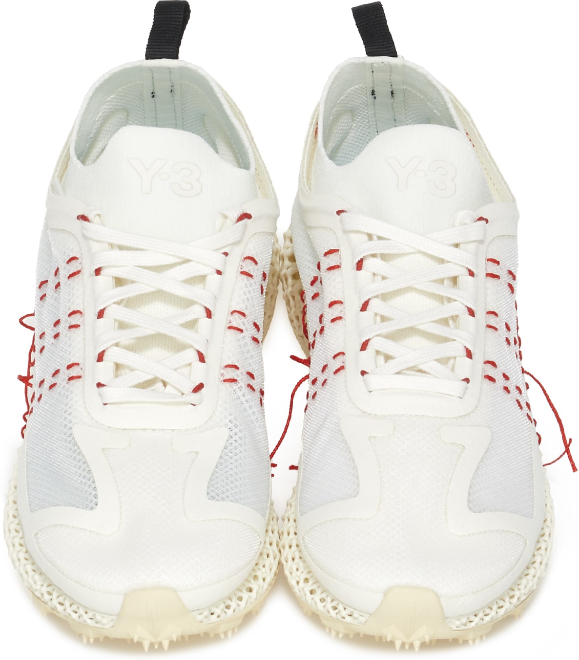 Baskets basses en mailles transparentes, fonctionnelles et modernes de style course. Fermeture à lacets à cinq crochets rouges. Construction en maille transparente. Semelle intérieure amovible de couleur cyan. Collier extensible ressemblant à une chaussette. Talon enveloppant en cuir ton sur ton. Tirette de talon en toile noire. Semelle intermédiaire en technologie 4D blanc cassé. Semelle extérieure à picots en caoutchouc durable crème. Marquage 3-Stripes rouge à double fil élastique sur les panneaux des quartiers. Impression graphique blanche "adidas Y-3" sur la semelle intérieure. Logo en caoutchouc ton sur ton 'Y-3' sur la languette. Lacets cirés ton sur ton. Fermeture à lacets.